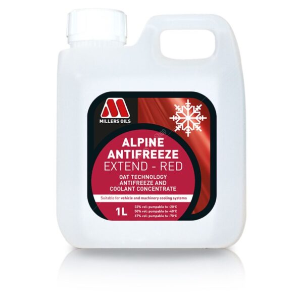 Millers Alpine Antifreeze Extend Red concentrate is an ethylene glycol based automotive antifreeze and coolant, suitable for all year round use in the cooling systems of all internal combustion engines. Utilising OAT (Organic Acid Technology). This product does not contain any nitrates, amines, phosphates, borates, silicates or any other mineral additives.