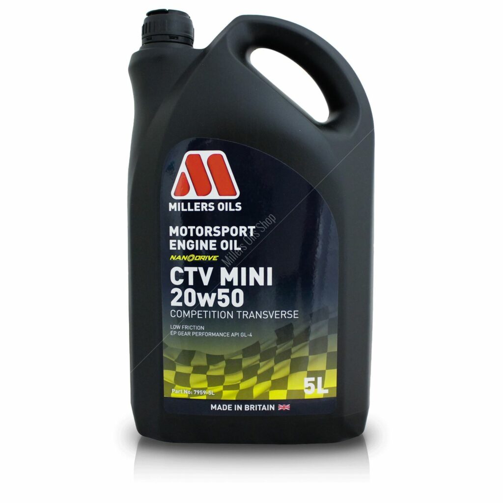 Millers CTV Mini 20W50 Engine Oil is a Semi Synthetic Competition Engine Oil, specifically formulated using NANODRIVE TECHNOLOGY for competition Minis and any application where the engine and gearbox share a common oil.